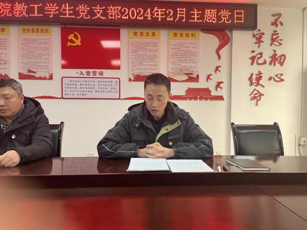 2024年2月28日,公司教工员工党支部在三教316党员活动室开展了以“踌厉奋发担使命,勇毅前行开新局”为主题的2024年2月主题党日,学院教工员工党支部全体党员参加会议。会议由学院教工员工党支部组织纪检委员王金国主持。