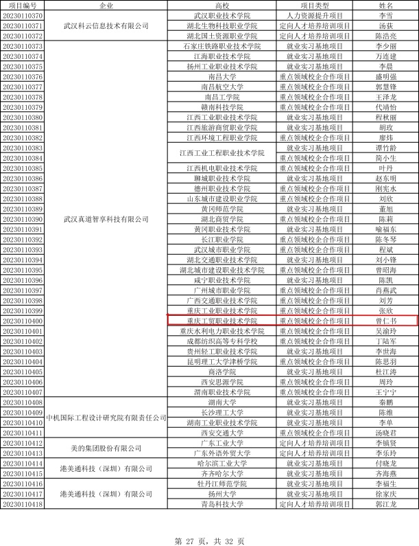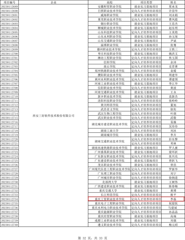 供需对接就业育人项目是教育部落实党中央、国务院“稳就业”“保就业”决策部署的举措之一,旨在深化高等教育改革、产教融合、校企合作,推动就业与人才培养有机联动、人才供需有效对接,主要分为定向人才培养培训、就业实习基地、人力资源提升、重点领域校企合作项目四类。自2022年10月第二期供需对接就业育人项目启动征集以来,公司积极响应,主动对接项目需求,积极组织教师提交项目申请。最终,公司与武汉真道智享科技有限公司合作的重点领域校企项目、与西安三好软件技术股份有限公司合作的定向人才培养培训项目喜获立项。
